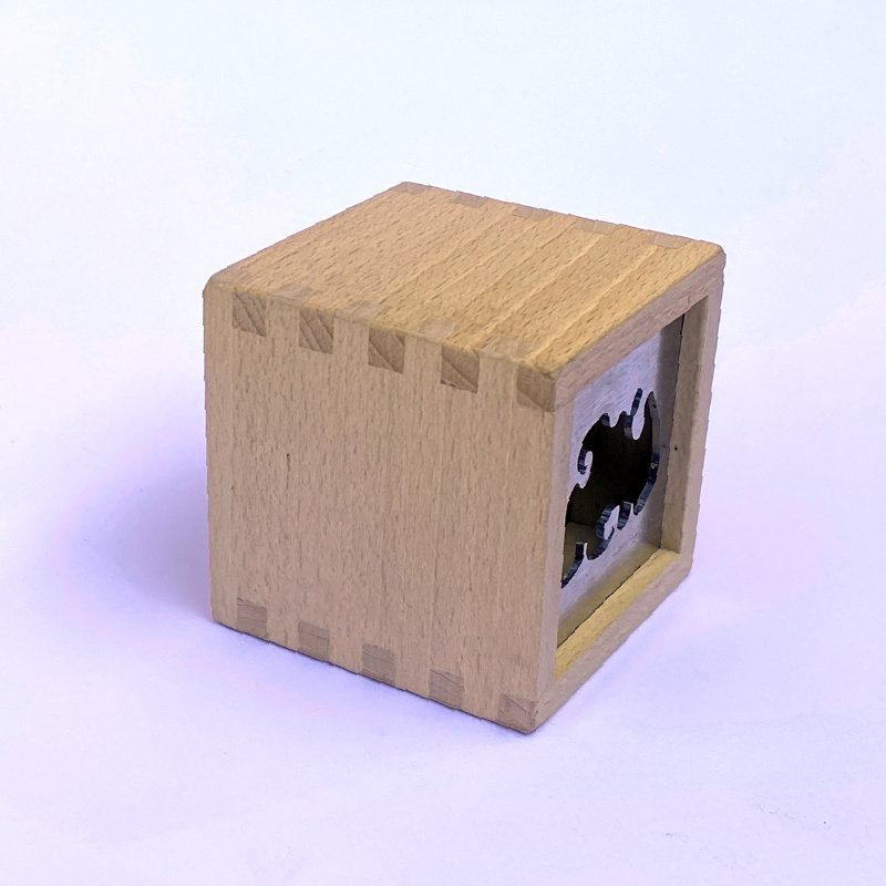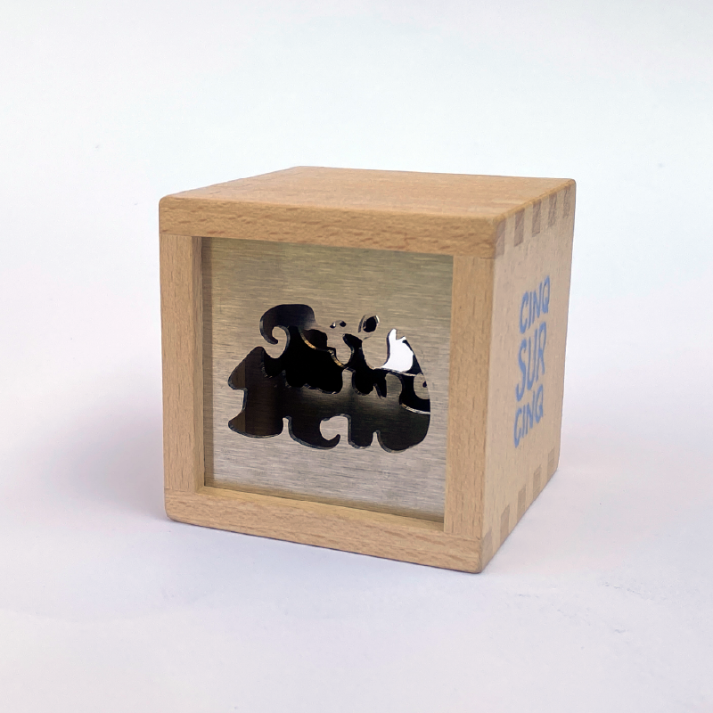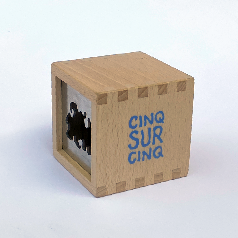 Cinq sur cinq est réalisé en hêtre. Il est composé de 4 faces assemblées à queues droites à l'intérieur desquelles sont disposées 4 plaques d'aluminium découpées selon des formes bien particulières
